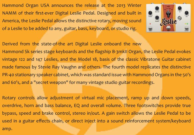 Januari 2013 Winter Namm Show in Anaheim, California USA: Hammond gaat een nieuwe markt opzoeken. Zoals bekend, werden en worden vele Leslies gretig door gitaristen gebruikt. Evenals in voorbije jaren worden er zelfs speciaal voor deze groep exemplaren gebouwd en geleverd, o.a. de bekende modellen G-27 en G-37. Deze Leslies zijn echter om redenen van financiën en transport mogelijkheden, liever gezegd de transport beperkingen, niet voor elke gitarist weggelegd. Daarom gebruiken gitaristen al sinds geruime tijd het zgn. effectpedaal of een combinatie van meerdere tegelijk. Hieronder een woeste opstelling van een wel heel vooruitstrevende gitarist.
