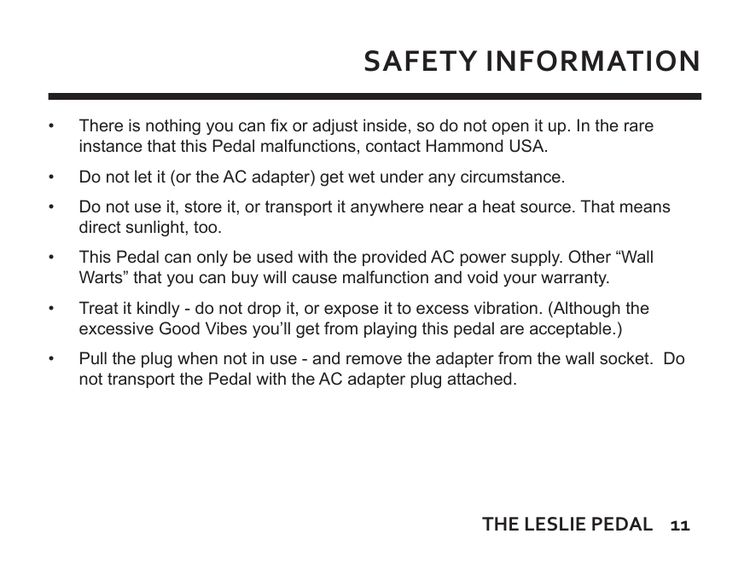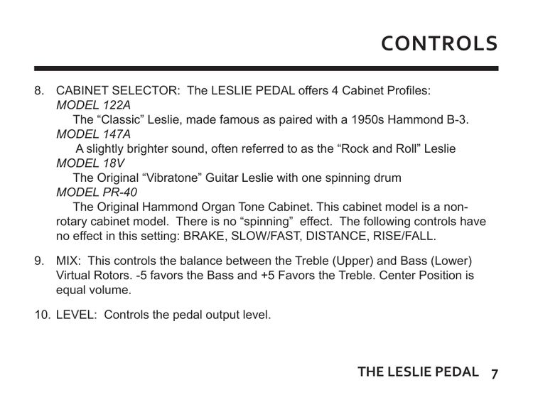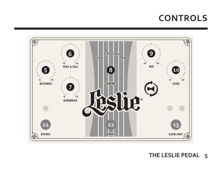 Rotary controls allow adjustment of virtual mic placement, ramp up and down speeds, overdrive, horn and bass balance, EQ and overall volume. Three footswitches provide true bypass, speed and brake control, stereo in/out. A gain switch allows the Leslie Pedal to be used in a guitar effects chain, or direct inject into a sound reinforcement system/keyboard amp.