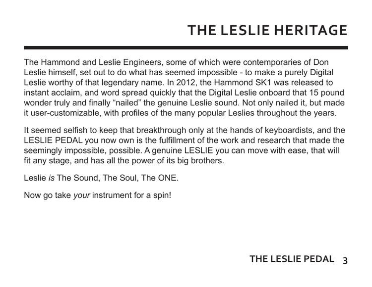 Met deze technologie in huis, gecombineerd met Hammond's nieuwe marktstrategie, heeft dit geleid tot een voor Hammond nieuw, maar wellicht succesvol produkt: het Hammond Leslie-Pedal, ontworpen en gefabriceerd in de U.S.A.