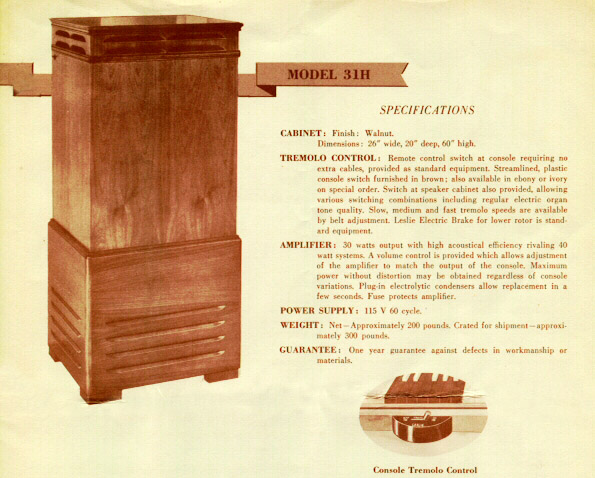 Ook dit model was eigenlijk uitsluitend gemaakt voor de gebalanceerde output van een Hammond "G-G" (bijv. model B of C) In principe weinig anders dan de 31 A, op een paar kleine amp modificaties na. Op dit moment (1950) werd door de fabriek een letter toevoeging geintroduceerd, nl. H voor Hammond, W voor Wurlitzer en C voor Conn.
