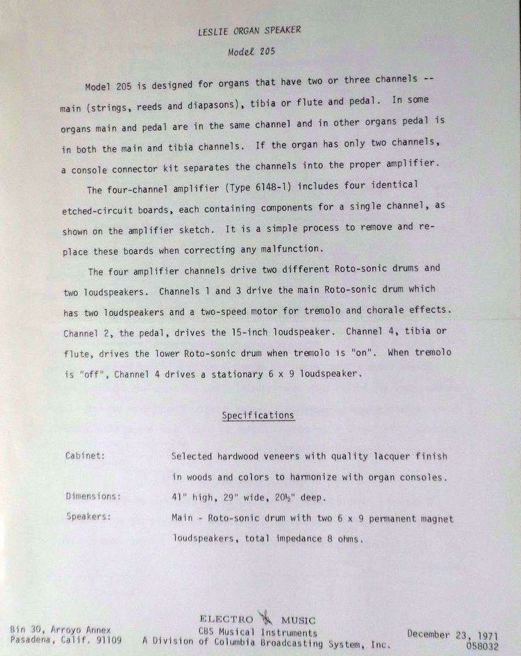 De Leslie 205 was een voortborduren van het 202-principe. Door een aantal modificaties kon de 205 nu ook voor meerdere merken gebruikt worden, wat de markt natuurlijk vergrootte. Hij was geschikt voor zowel 2,- als 3-kanaals orgels. De versterker was 4-kanaals. Wellicht is het de enige Leslie ooit gebouwd met boven 3 en onder 4 ononderbroken Louvres.
