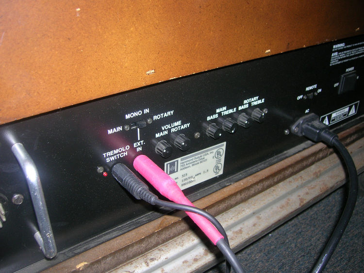 In addition to the 11-pin interface designed for use with Hammond XB-Series products (XB-2, XB-5, XB-3, XC-3 and A-205), the 323 has a1/4" input jack. An external sound source such as a portable organ, personal keyboard, synthesizer, etc., can be directly connected, eliminating the need for a separate preamp. A foot switch connector allows a foot switch to be used to switch the rotors between "Fast" and "Slow". If a Stereo Plug to Mono Jack adaptor is used, two foot switches can be used to operate both Fast/Slow and On/Off modes. Bass and Treble tone controls and a Master Volume control allow the overall sound quality and sound level of the cabinet to be customized to individual preference. In addition, the "remote turn-on" feature allows the 323, with current kits, to be turned "on" and "off" from the organ console, making this Leslie Speaker the ideal choice for a large number of musical applications, including many traditional 2-channel organs.