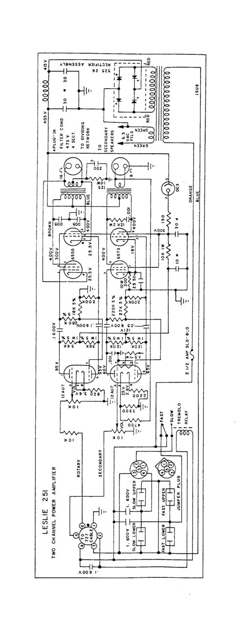 De versterker van deze Leslie is een twee kanalige buizen versterker met 2 maal 6550 eindbuizen voor rotary die 35 Watt leveren en 2 maal 6973 eindbuizen voor stationary, die 20 Watt leveren.