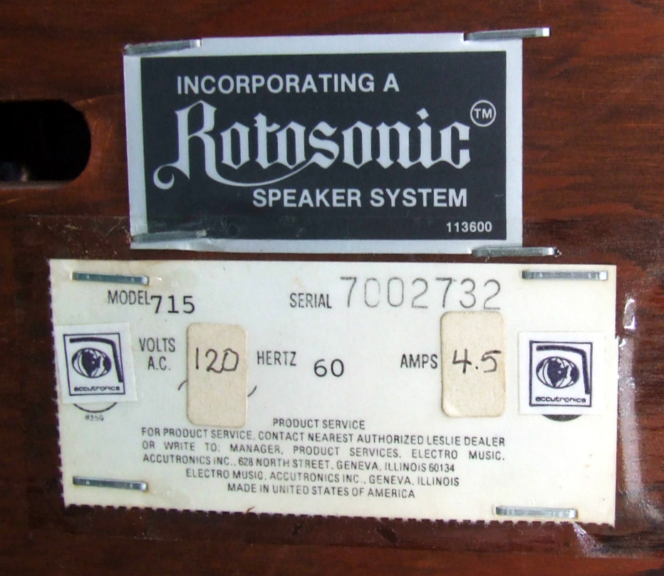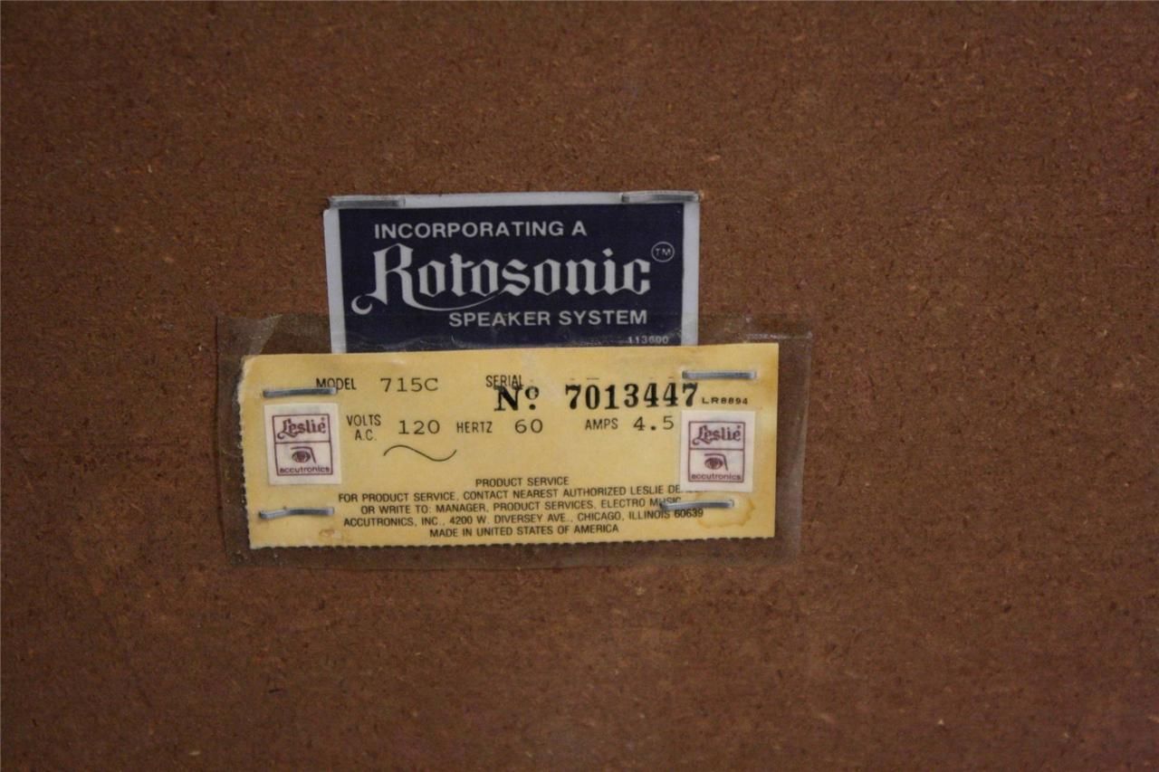 De 715 is een high-power kabinet met een normale Rotosonic drum en horn, alswel twee full range strakke kanalen met 6 x 9 speakers in zowel de linker, de voor als de rechterkant van het meubel. Het is een zeer goed klinkende Leslie met brede sound en gemiddeld genomen bedoeld voor alle Hammonds met een Leslie 11 pin out.