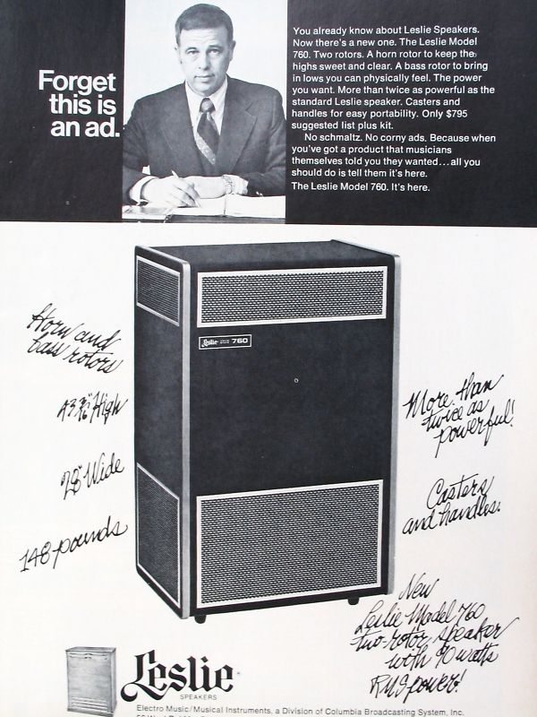 Deze Leslie 760 is de natuurlijke partner van de X-5, (foto hieronder) en andere portables, maar ook voor andere Hammonds, die van fabriekswege voorzien waren met een 9 pin Leslie. Dit model 760 is een 1 kanaals Leslie, die beschouwd kan worden als een transistor versie van de 122 en 147. Piano en dergelijke geluiden als die op Aurora's, Monarch, Grandee en Concorde en dergelijke worden dus niet weergegeven via een 760 serie speaker. Dan heb je een 710 nodig, die wel twee kanalen is.