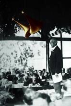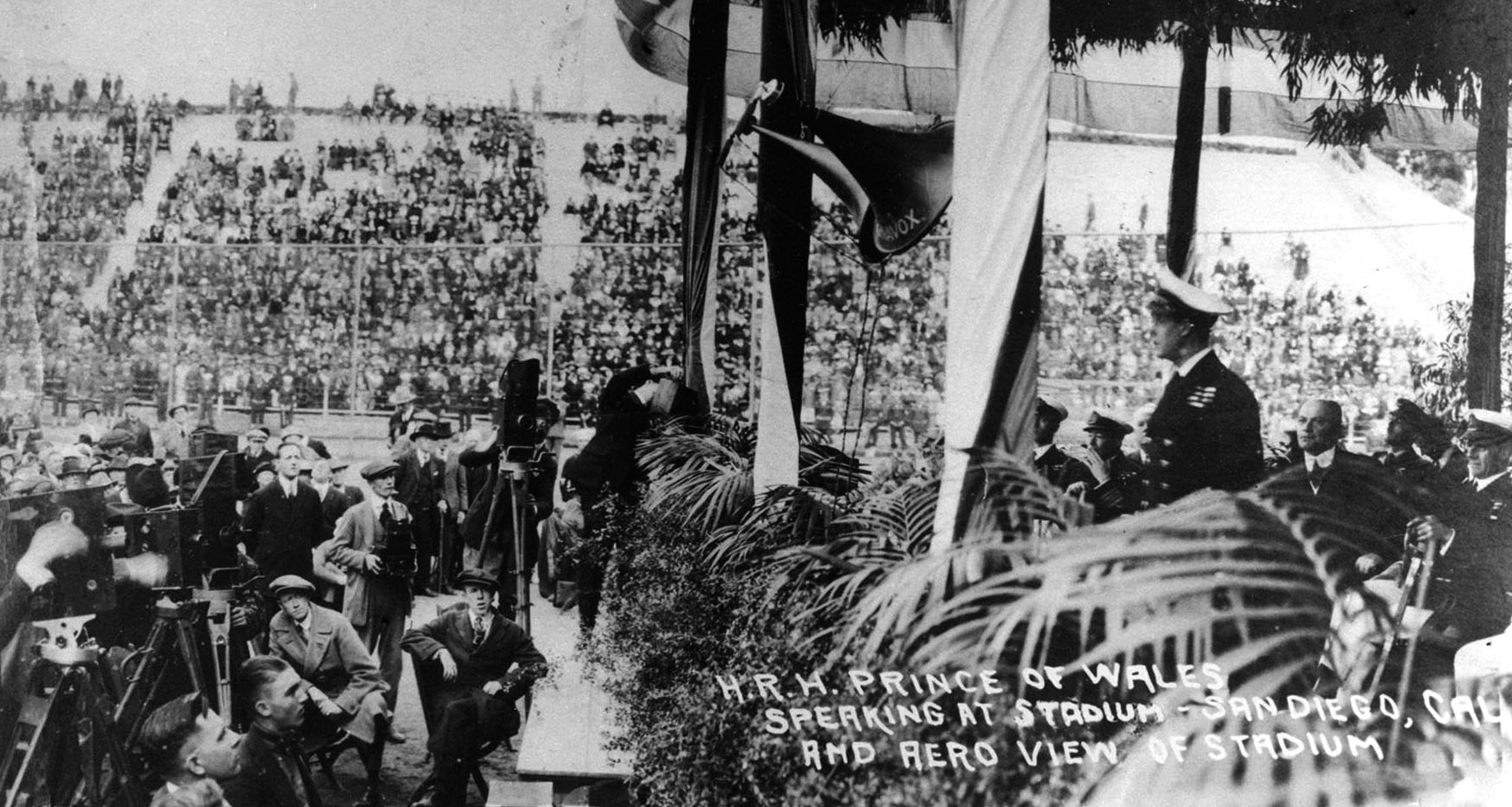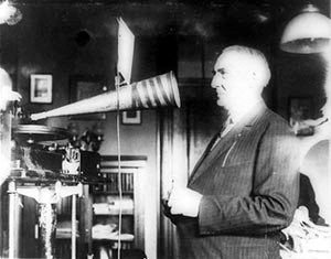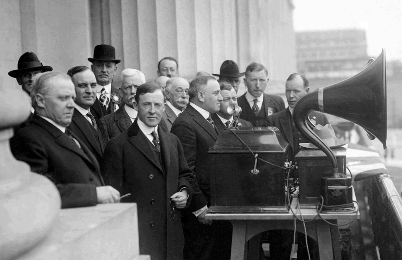President Woodrow Wilson uses loudspeaker in San Diego speech.