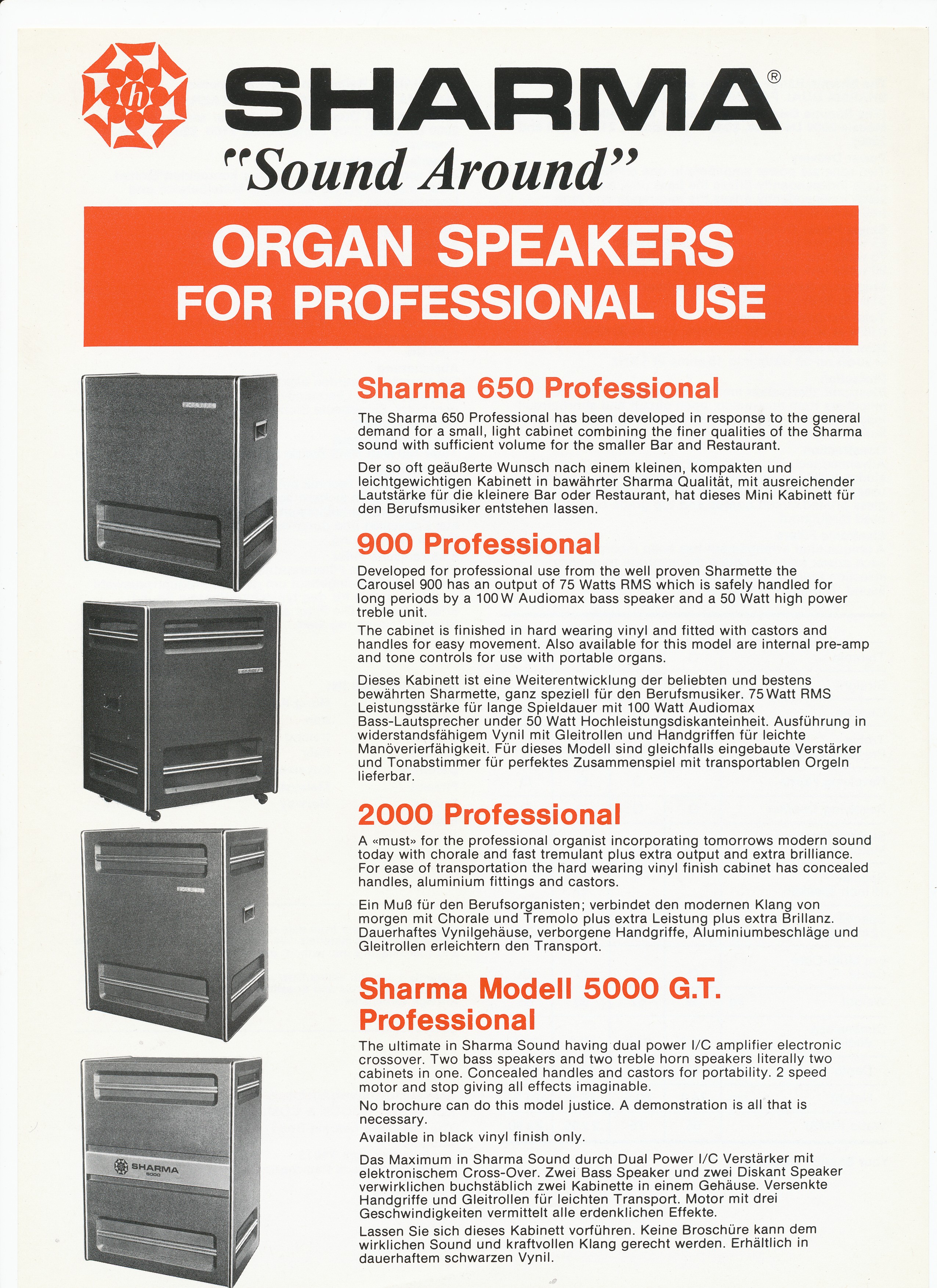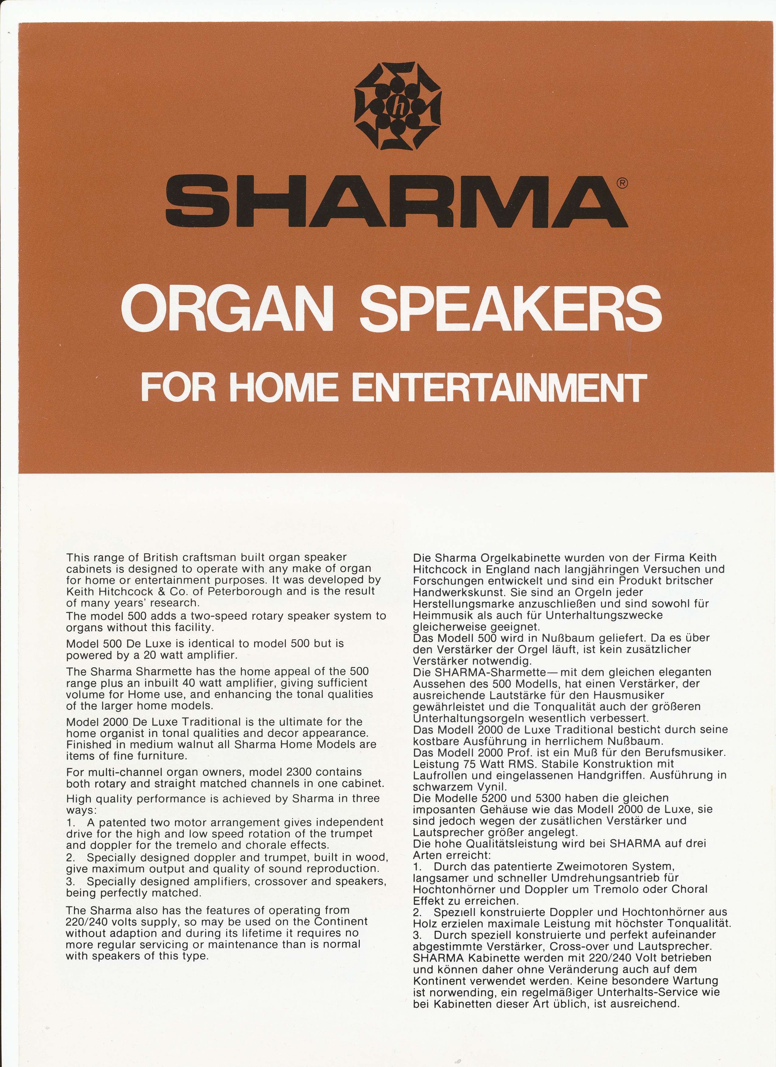 Toen de orgel fabrikanten begonnen met het toepassen van elektronische Leslie-effecten kwam Sharma nog met een serie strakke speaker-versterker systemen.