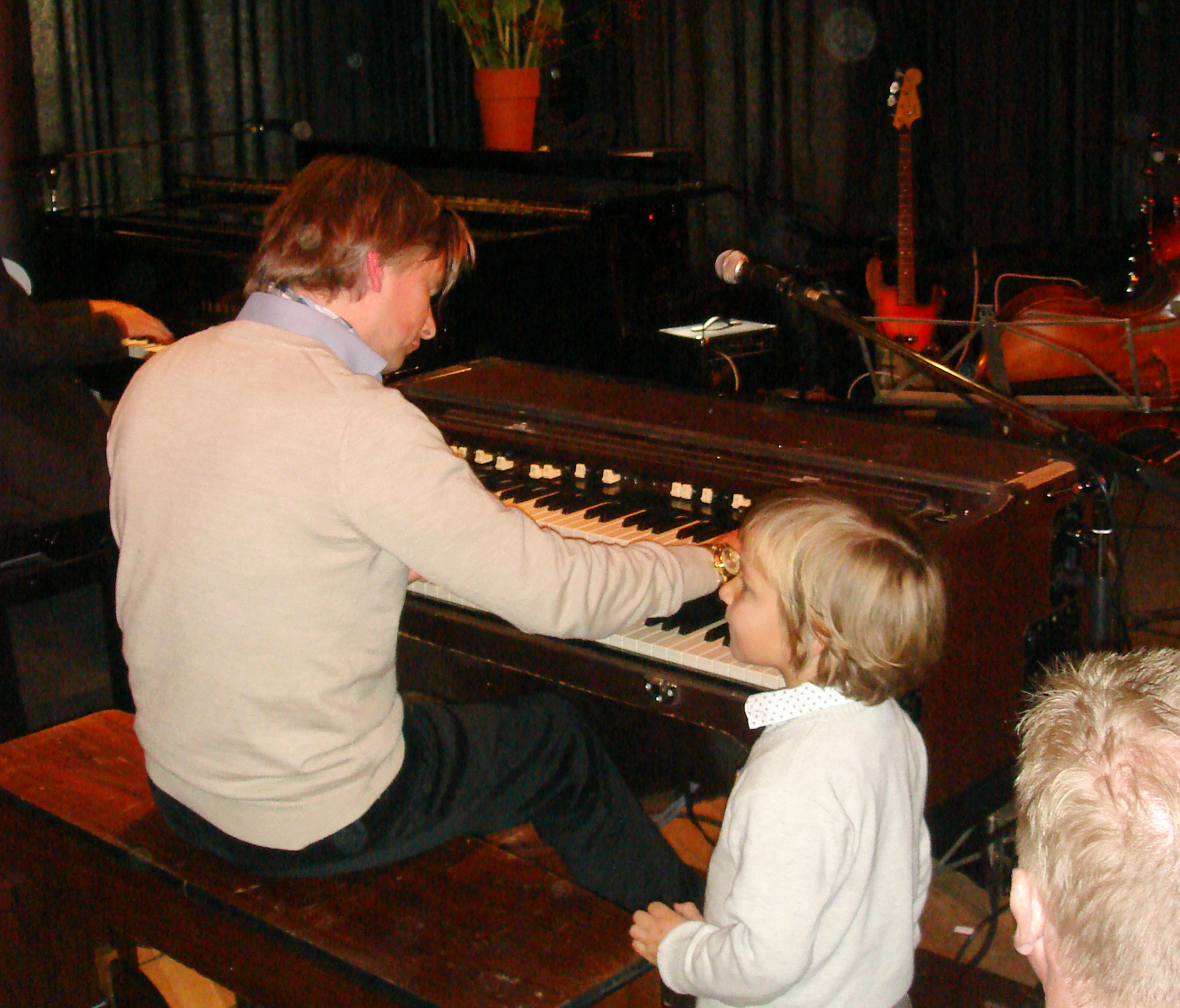 Van de redactie: Het optreden van Erwin kreeg een extra dimensie door de spontane begeleiding op drums en piano. John Hondorp speelde piano, maar is voor velen ook bekend als docent Hammond aan het conservatorium. Opmerkelijk was ook Erwin's zoontje van vijf jaar. Hij zat netjes rechts van zijn vader op de orgelbank om de ontluikende jamsessie met deze drie muzikanten zowel visueel als ook auditief te volgen. Je ziet maar weer: de fascinatie voor Hammond is van alle leeftijden!