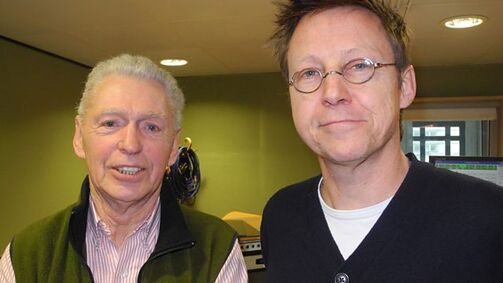 Hierboven in 2015 met Simon Mayo in de BBC studio voor een interview.