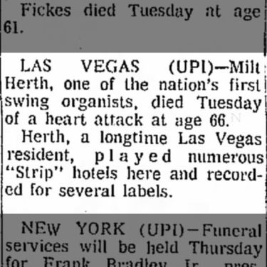 Milt Herth overleed op 66 jarige leeftijd aan een hartaanval.