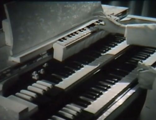 welke daardoor een extra soloklavier met leuke solostemmen kreeg, bleek bij navraag van Milt, dat Hammond hem op speciale bestelling ook in zwart, wit en parelmoer ("Mother of Pearl") leverde. Natuurlijk ging hij voor het laatste en bouwde hem niet onder het klavier, zoals eigenlijk de bedoeling was, maar boven het bovenklavier zoals hieronder te zien: