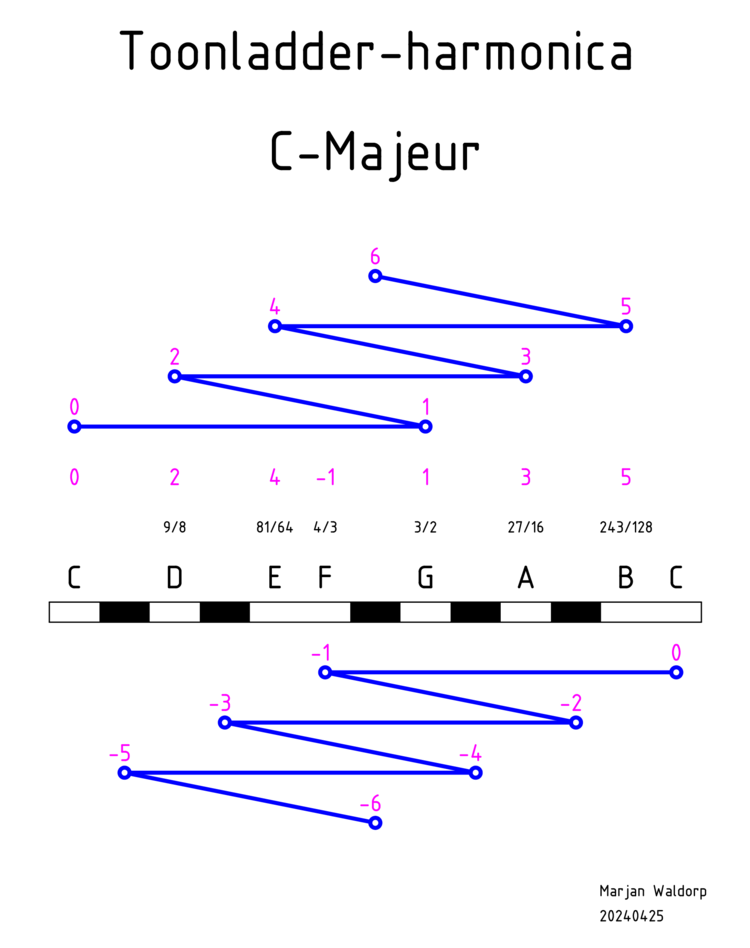 Duidelijk te zien is dat de uit deze zig-zag constructie voortkomende toonladder ongelijke toonsafstanden heeft! De toonlader heeft hele en halve toonsafstanden (diatonische toonladder). In de eerste kwintenstap C-G tekent zich dit patroon al onvermijdelijk af. Een kwint is 3 1/2 toonsafstand. Een octaaf is 6 hele toonsafstanden. Dus de toonladder zal minimaal twee halve toonsafstanden moeten bevatten. Voor de C-Majeur toonladder resulteert het verder zig-zaggen in het patroon 2 1/2 + 3 1/2. Dit verklaart ook de kenmerkende structuur van het klavier met een blokje van drie witte en twee zwarte toetsen, gevolgd door een blokje van vier witte en drie zwarte toetsen. Het komt allemaal door de kwint!